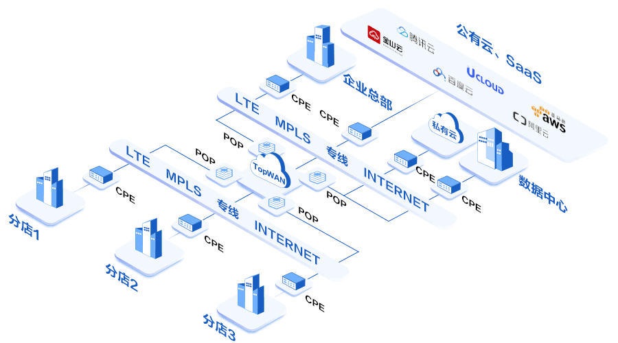 为帮助客户解决上述问题,科华数据向客户提供基于SD-WAN技术的TopWAN组网解决方案。该组网方案旨在为客户提供更便捷、更灵活、更安全,且成本可控的传输优化服务,对客户现有网络架构不做任何调整,终端设备即插即用,支持互联网、专线、5G等多种接入方式,完美的解决客户最后一公里的问题。我们利用先进的技术和优质的网络资源,为客户构建可以媲美专线的高质量、高冗余混合骨干网络。同时,对“接入网络”+“骨干网络”可进行统一管控,实现了端到端的全链路优化,并通过可视化监控界面,对所有链路使用情况的实时监控,具备完善的告警机制,保障出现故障时可以及时发现、响应、定位和快速解决问题。